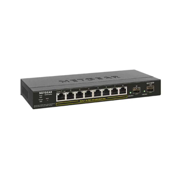 سوئیچ شبکه 10 پورت PoE نت گیر GS310TPتوان مصرفی این سوئیچ 10 پورت مدیریتی 69.3w است و 8 پورت شبکه ای و 2 پورت Uplink و 1G SFP (fiber) ports میباشد .